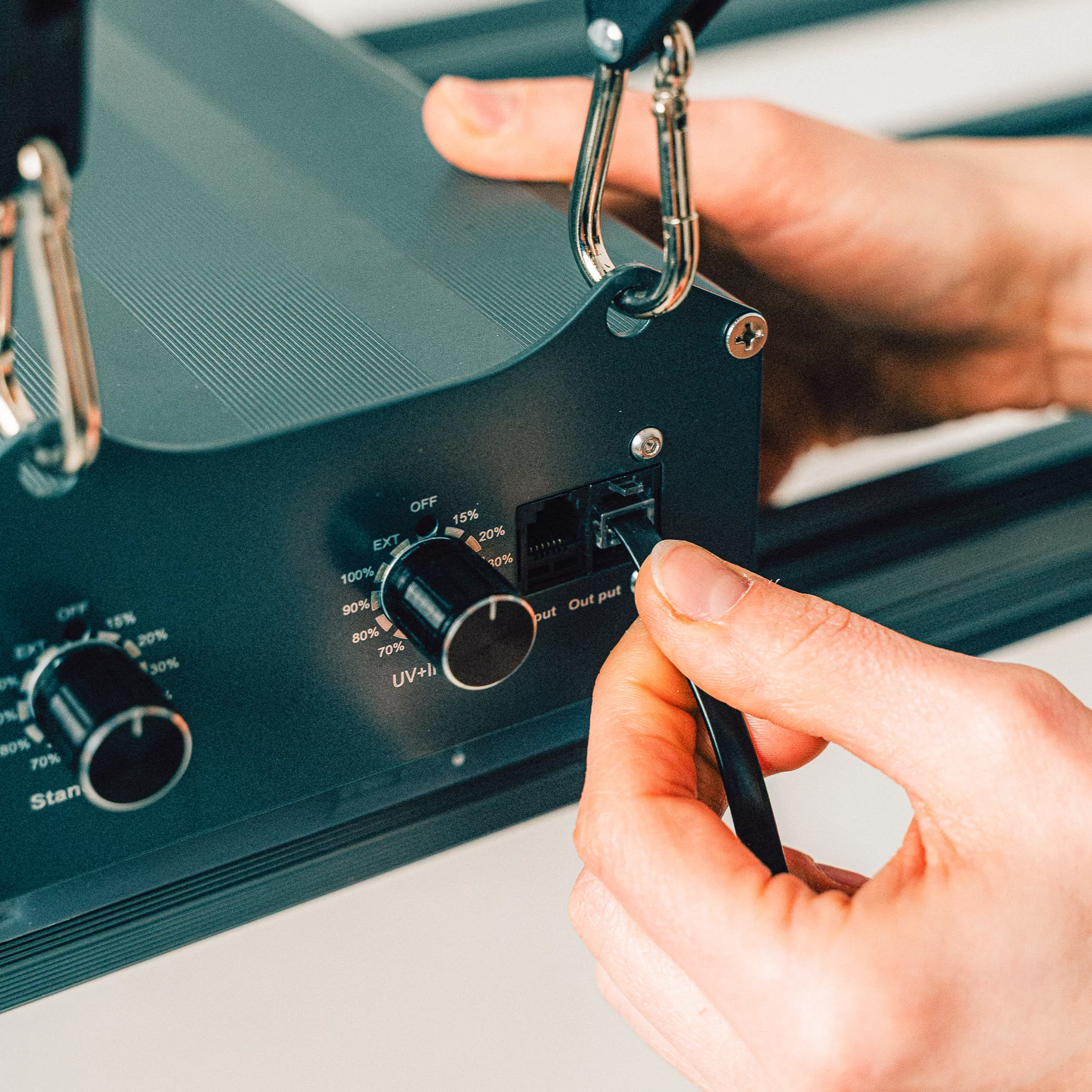 La lámpara es regulable (2 canales) y se puede controlar manual o digitalmente a través del controlador. Gracias a la refrigeración pasiva, funciona silenciosamente y está óptimamente protegida contra la humedad con IP65.