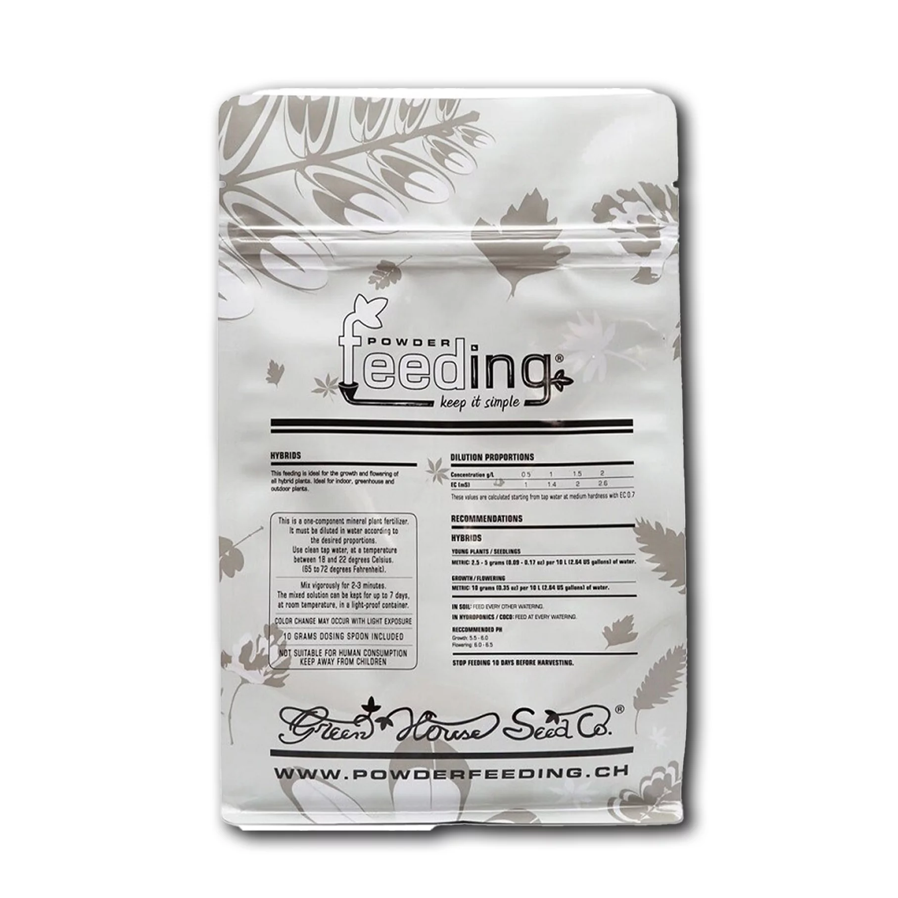 Green House Feeding Hybrids s'utilise pendant toute la phase de floraison. Mélangez la poudre avec de l'eau et arrosez régulièrement les plantes afin d'assurer un apport régulier en nutriments.